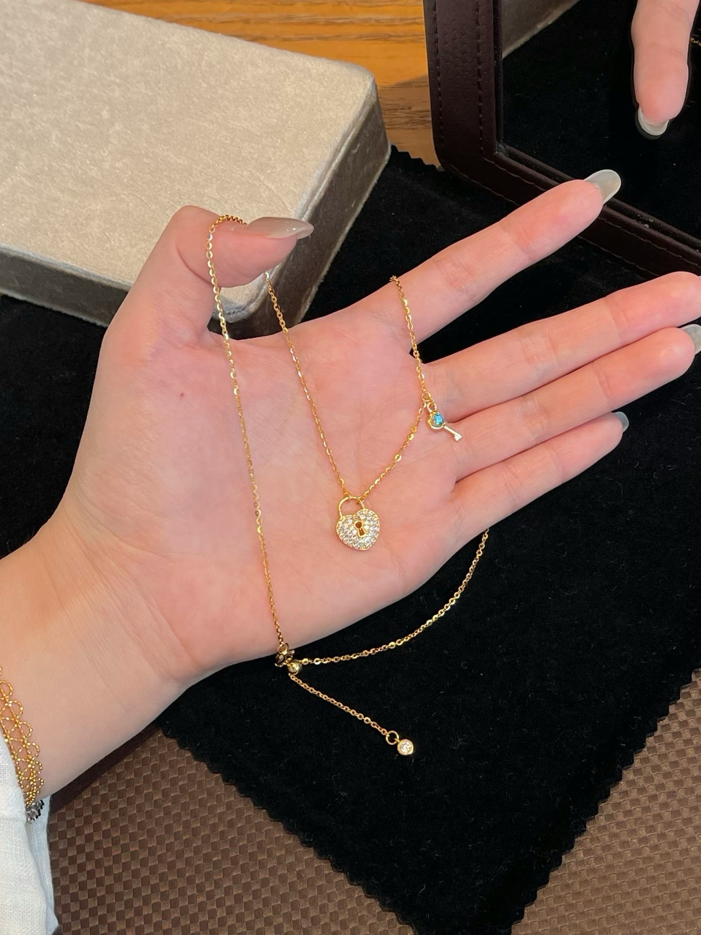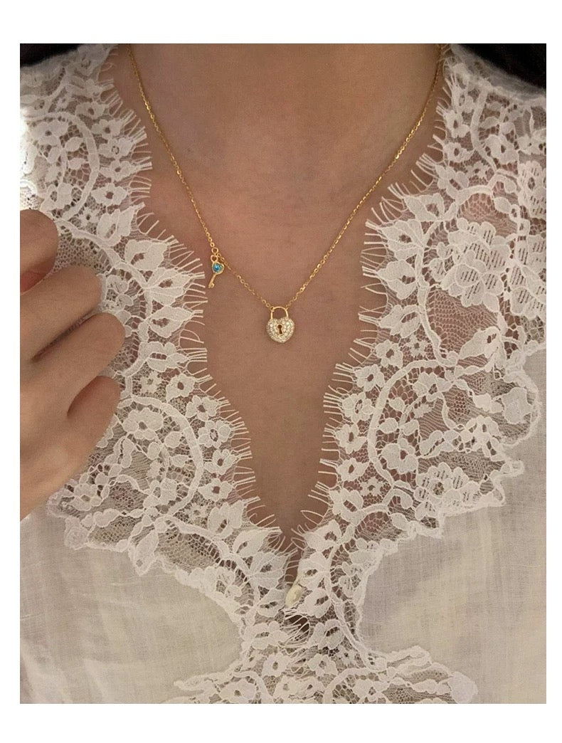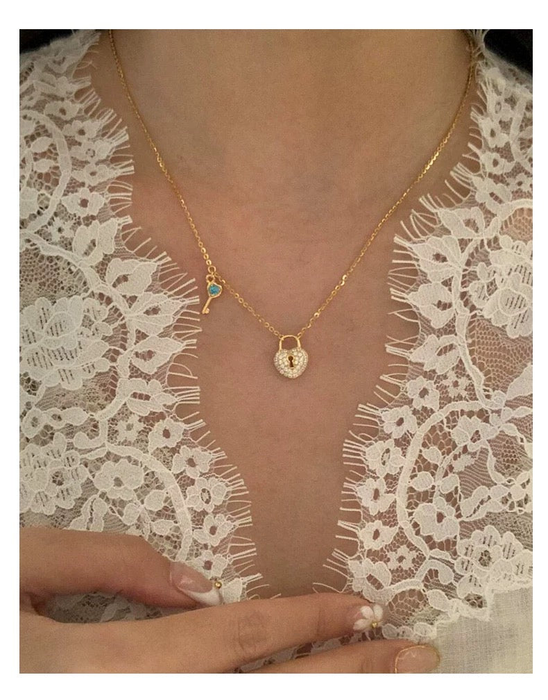 Simbolo di amore e mistero, la Collana Key è un gioiello che racconta una storia. Realizzata in argento S925 placcato oro 18k, presenta un ciondolo a forma di lucchetto a cuore decorato con zirconi luminosi e una chiave con dettaglio di pietra blu. Un tocco romantico che rende speciale ogni look quotidiano.